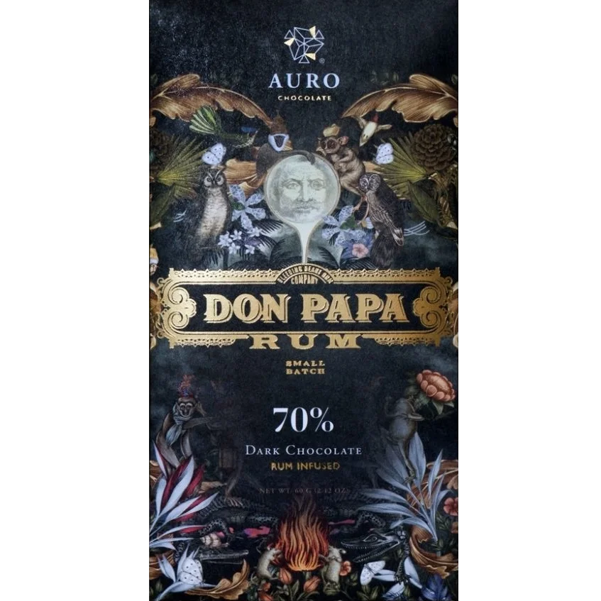 To create this chocolate, Auro gets together with Don Papa rum. With cacao from Saloy Estate, the result is a smooth and delicious rum infused dark chocolate. Herbal and cherry like notes of the cacao infused with rum creates a rich and complex flavor profile.