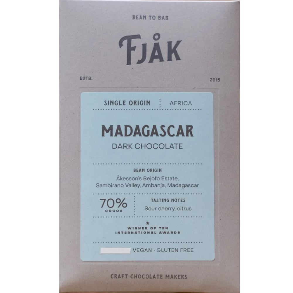 Crafted from single-origin cacao, Fjåk’s 70% dark chocolate from Madagascar offers a complex, vibrant flavor profile, delivering a pure and intense taste experience that reflects Madagascar’s unique terroir. Sweet cherry notes very clear in this creamy organic chocolate.