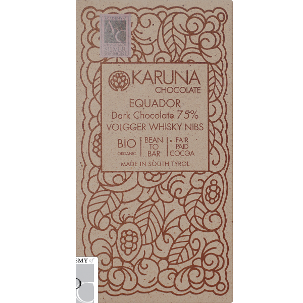 Dark chocolate made from beans from Ecuador, combined with cocoa nibs soaked in whisky.
