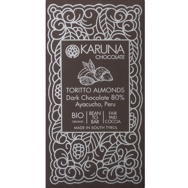 Crafted from cocoa beans sourced from the Vraem region of Ayacucho, this 80% dark chocolate combines the beans’ warm, spicy aromas with the crunch and flavor of roasted Toritto almonds.